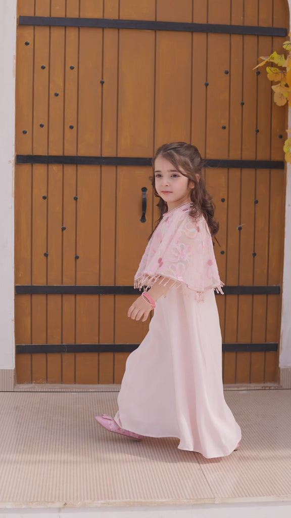 Let her shine this festive season with Roseveil, a dreamy 2-piece girls’ cape outfit designed for little ones who love soft sparkle and elegant flow. Crafted for Eid celebrations, weddings, birthdays, and formal family gatherings, this luxury ensemble blends delicate craftsmanship with modern festive style.