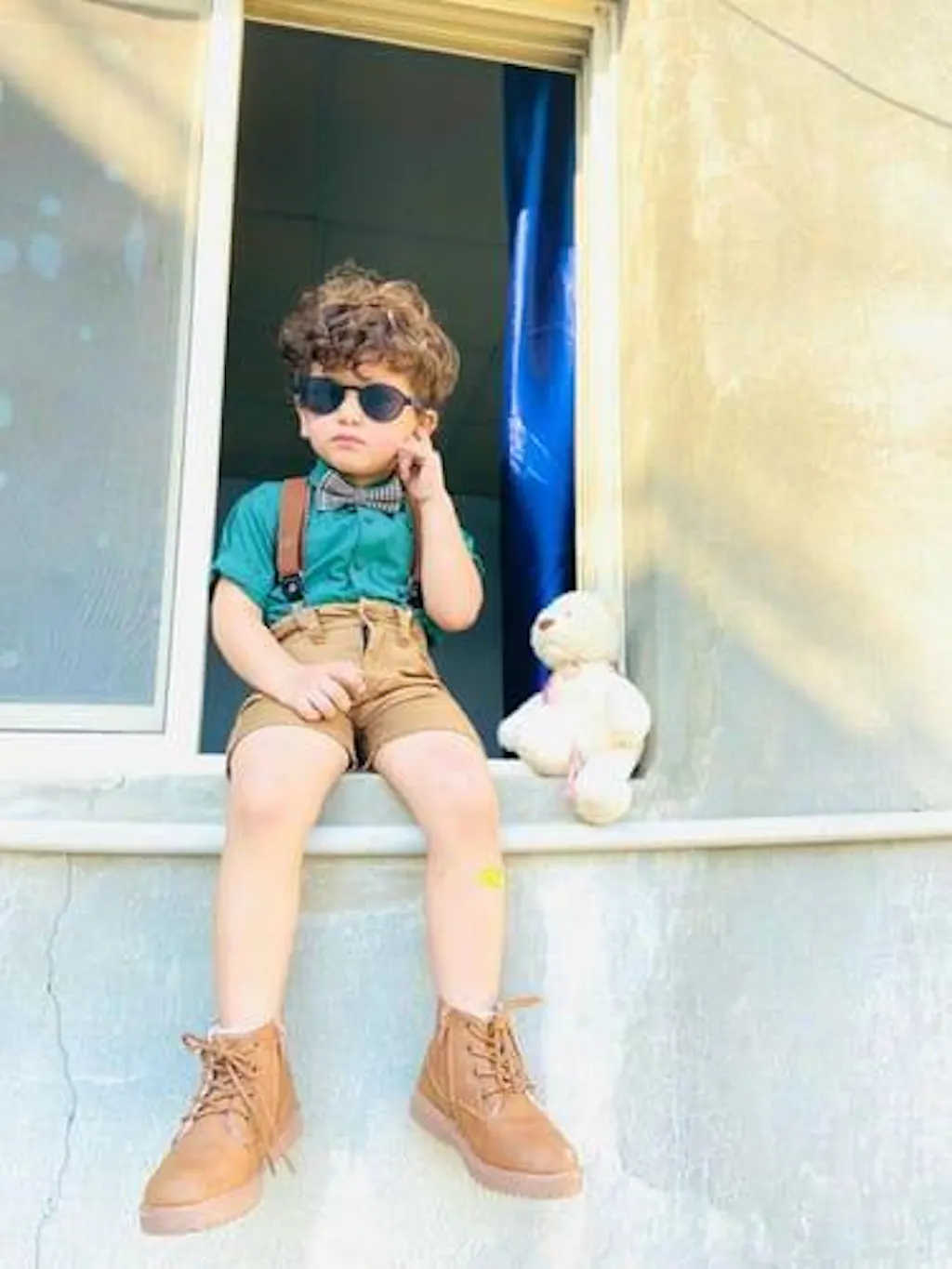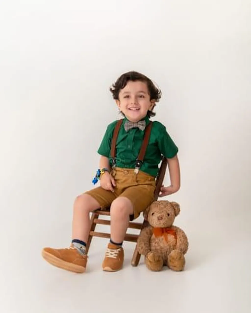 A green shirt paired with brown shorts and brown suspenders with a matching bow tie creates a stylish and trendy outfit for boys. The green shirt is made from a soft, breathable fabric and features a button-up front, short sleeves, and a classic collar. The shirt has a vibrant shade of green, which complements the earthy tone of the brown shorts and suspenders.
